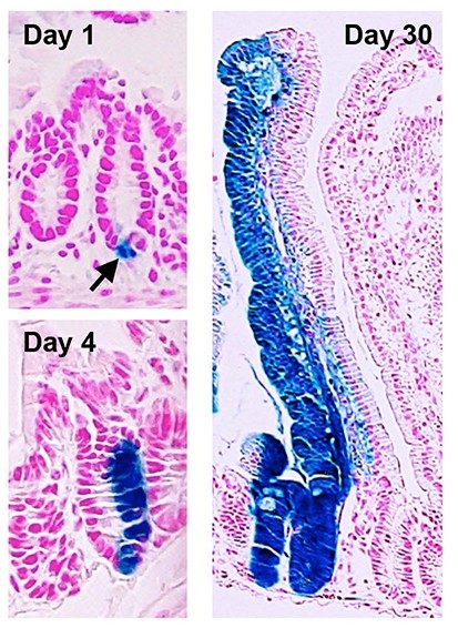 右侧的图像显示了遗传谱系追踪实验的结果,表明肠土底部底部的SetDB1表达细胞是能够产生肠上皮的所有细胞类型的肠干细胞。