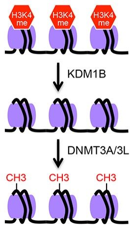 右边的图像显示了配子发育过程中基因组印记建立的模型。我们建议去除H3K4甲基标记(通过KDM1B或其他H3K4 kdm)是新创生殖细胞印迹控制区DNA甲基化(通过DNMT3A-DNMT3L复合物)。