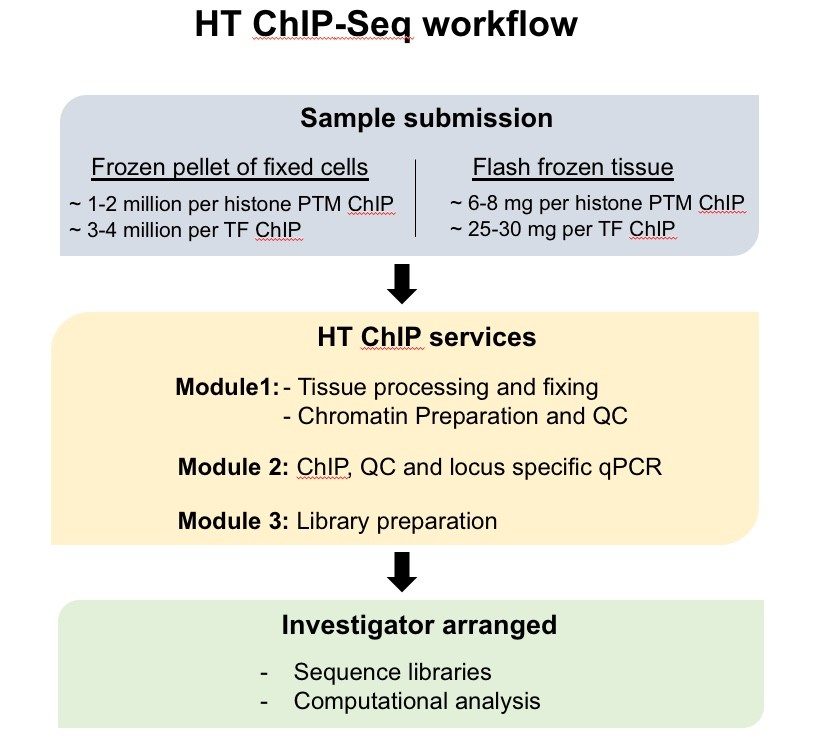 成功的芯片实验需要高质量的染色质。作为我们服务的一部分,我们将从固定细胞的冷冻颗粒或从闪蒸组织中制备高质量的染色质。请与我们联系以获取样品准备指南。通过在进行芯片之前进行的质量控制措施确保染色质完整性。一旦制备了染色质,我们将使用我们的核心供应的芯片验证的抗体进行芯片,如下所述,或者调查者提供的抗体*。