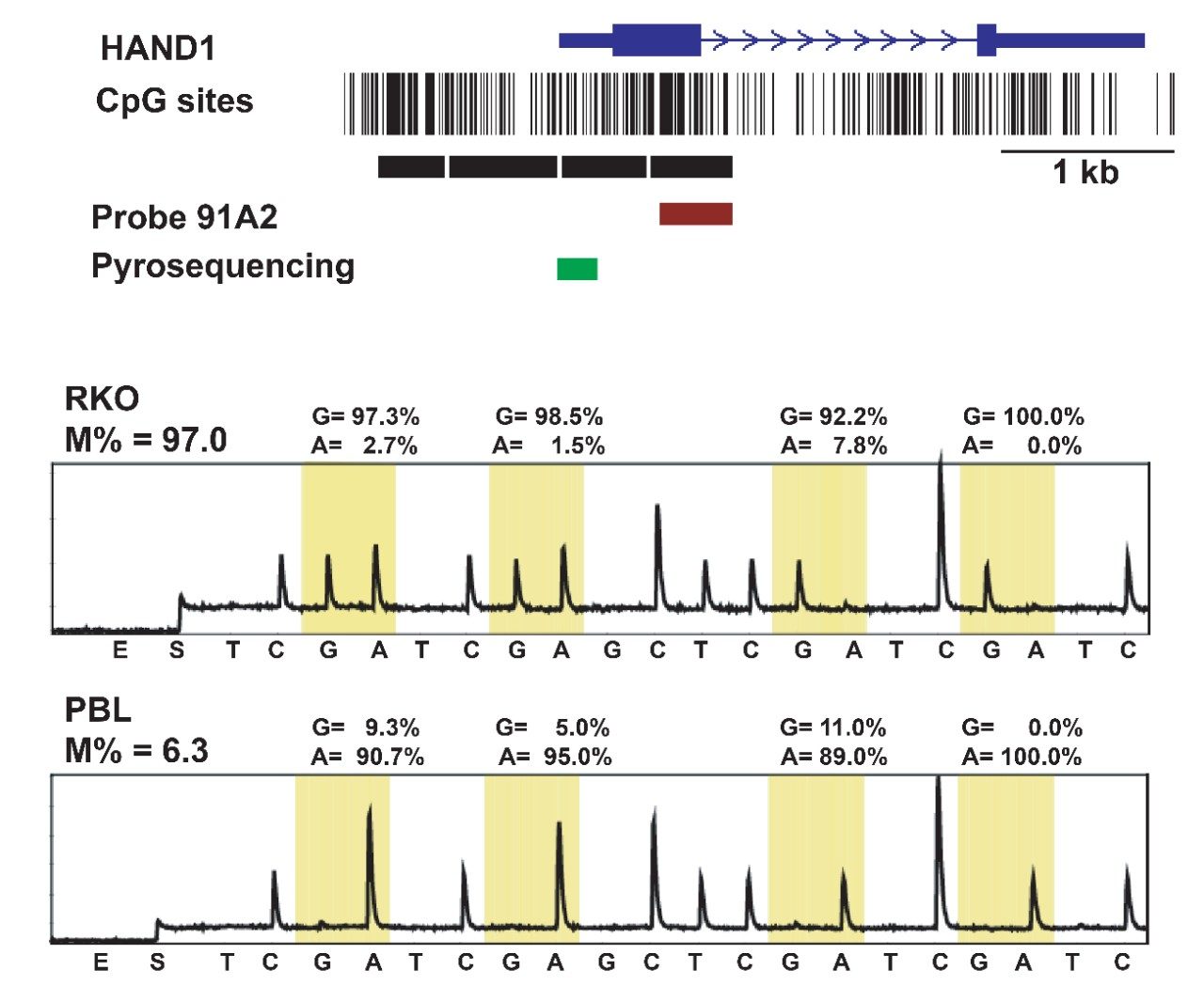 在右边的图像中,靠近基因转录起始点的区域手1基于先前的微阵列实验选择了用于测定设计。放大区域覆盖了四个CPG位点,其以黄色突出显示。在该实施例中,结肠癌细胞系RKO在所有检查的CPG位点(平均= 97%)显示出高水平的DNA甲基化,但在正常外周血淋巴细胞(6.3%)中相同的基因未甲基化。