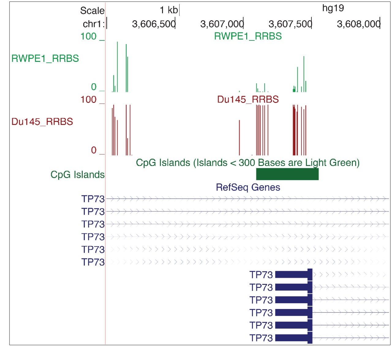 该图像显示了前列腺细胞系RWPE-1和DU145的RRB数据的基因组浏览器视图。每个垂直条显示一个CpG位点的甲基化密度,范围为0%至100%。示出了差异甲基化区域(DMR)与替代转录开始部位的CPG岛重叠TP73基因。