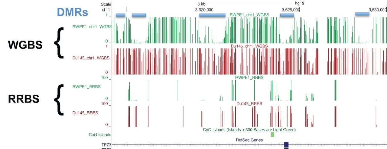 右边的基因组浏览器视图显示了WGBS数据与RRBS数据的对比TP73在前列腺细胞系RWEP-1和Du145中。在整个基因体中可以看到多个不同的甲基化区域。